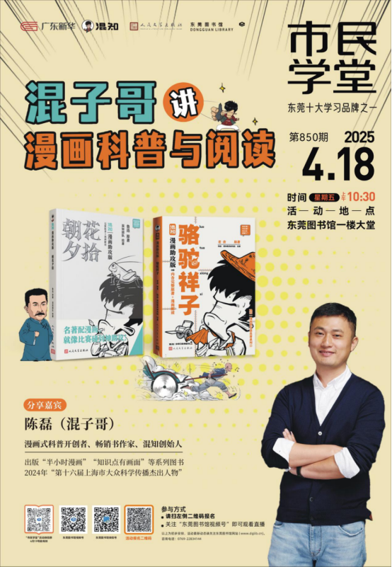 讲座将于4月18日10:30在东莞图书馆一楼大堂举行,市民可通过扫描二维码免费报名。届时,观众不仅能近距离感受混子哥的“知识脱口秀”,参与现场阅读分享互动,更有机会获得作家亲笔签名。