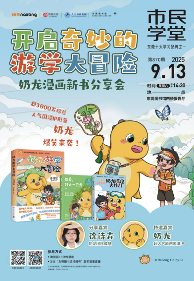 如今,这份诗意将以最生动的方式呈现!风靡全网、拥有3800万粉丝的国民IP奶龙,携新书《奶龙游学大冒险:诗词篇》来东莞图书馆和我们亲密接触啦!奶龙的漫画作品不仅温馨治愈,而且脑洞大开,每一次阅读都能带给我们满满的快乐和治愈力量。9月13日(星期六)14:30,奶龙将在东莞图书馆市民学堂举行漫画新书分享会,带大家一起领略中华诗词之美!在分享会中,我们将了解到奶龙背后更多趣事,与分享嘉宾面对面交流,拿到亲笔签名书……