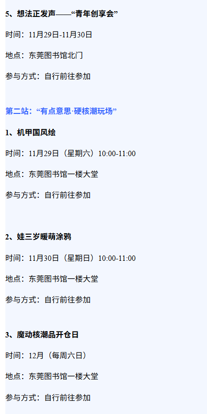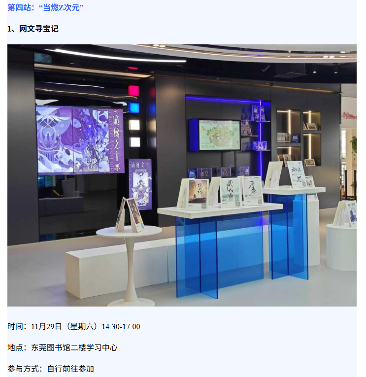 如在第一站“‘阅读·靠近点’露天市集”,香飘四季、苍穹之上、九万里艺术空间等“·莞”空间将联动开展以“自然野趣+阅读社交”的场景化露营集市,“·莞”空间联盟成立两年以来吸纳成员超过60家,成为东莞文旅版图的一道独特风景线,其间还将举行创意书展、书菜盲盒交换、青年创享会、肖像绘制以及拼贴诗和植物手作等活动;第二站则将展出“阅世观潮:魔动核国风制造×娃三岁治愈美学双生展”,让你在硬核与治愈的潮玩表达中,聆听匠心与创意潮玩背后的莞造故事,第三站将在全新升级的绘本馆沉浸式参与绘本故事;第四站“当燃Z次元”,将成为网络文学爱好者们的圣地……这将是一次深度探索东莞图书馆这座“青春文化地标”的美妙旅程。